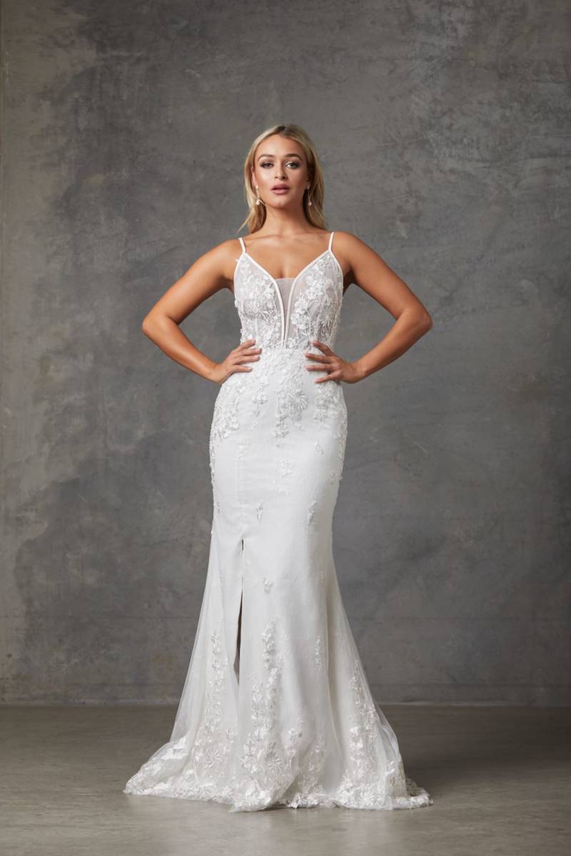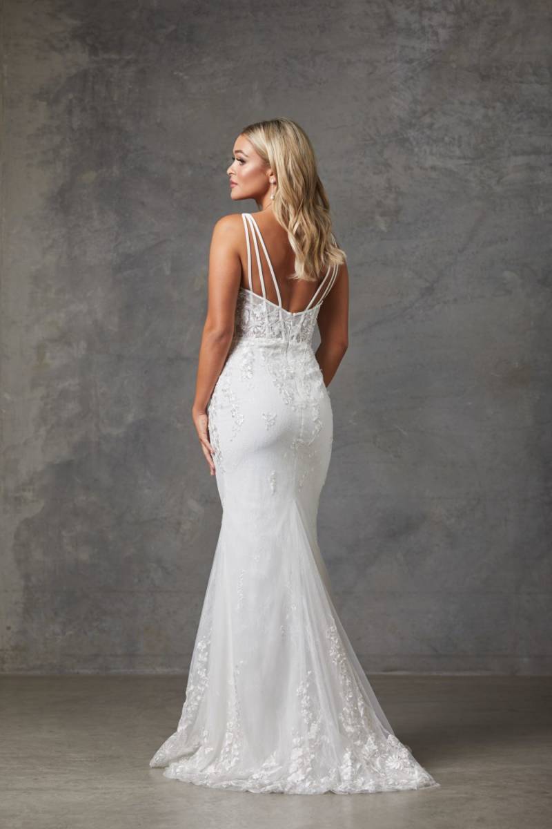 The Ornela Wedding Dress captivates with a deep V plunging neckline and beaded lace applique overlay. A modest fitted mermaid soft lace skirt continuing down to a side leg split and back with three straps featured for some back detail.