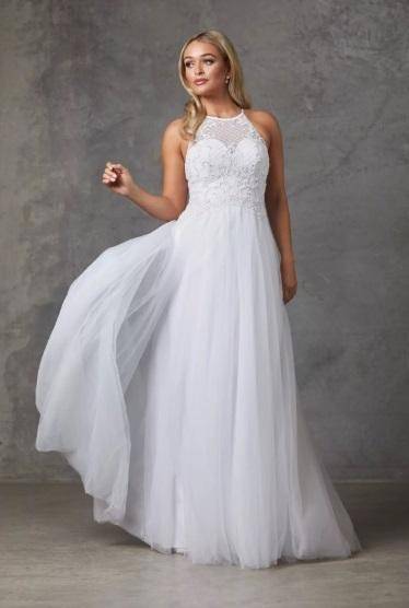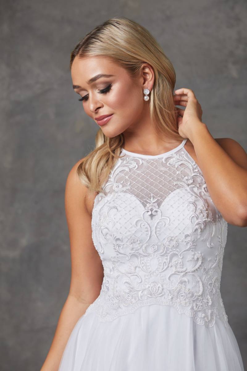 Sheer embroidered lace set high over a sweetheart bodice gives way to a full gathered tulle skirt.
