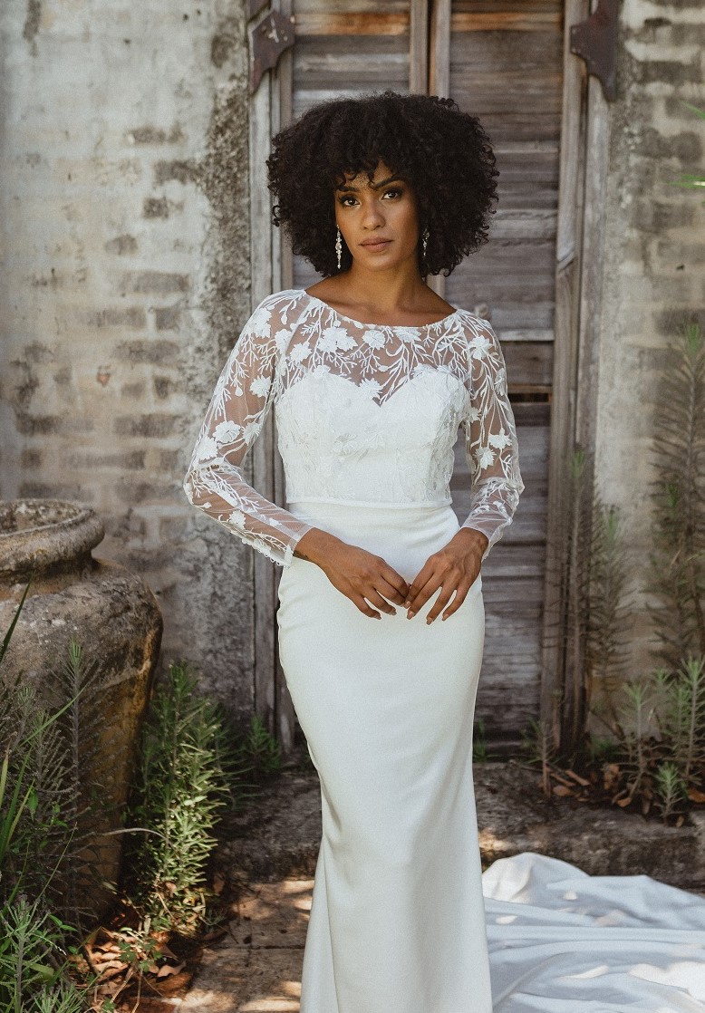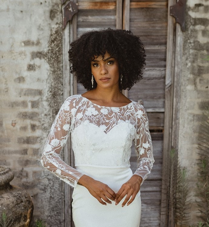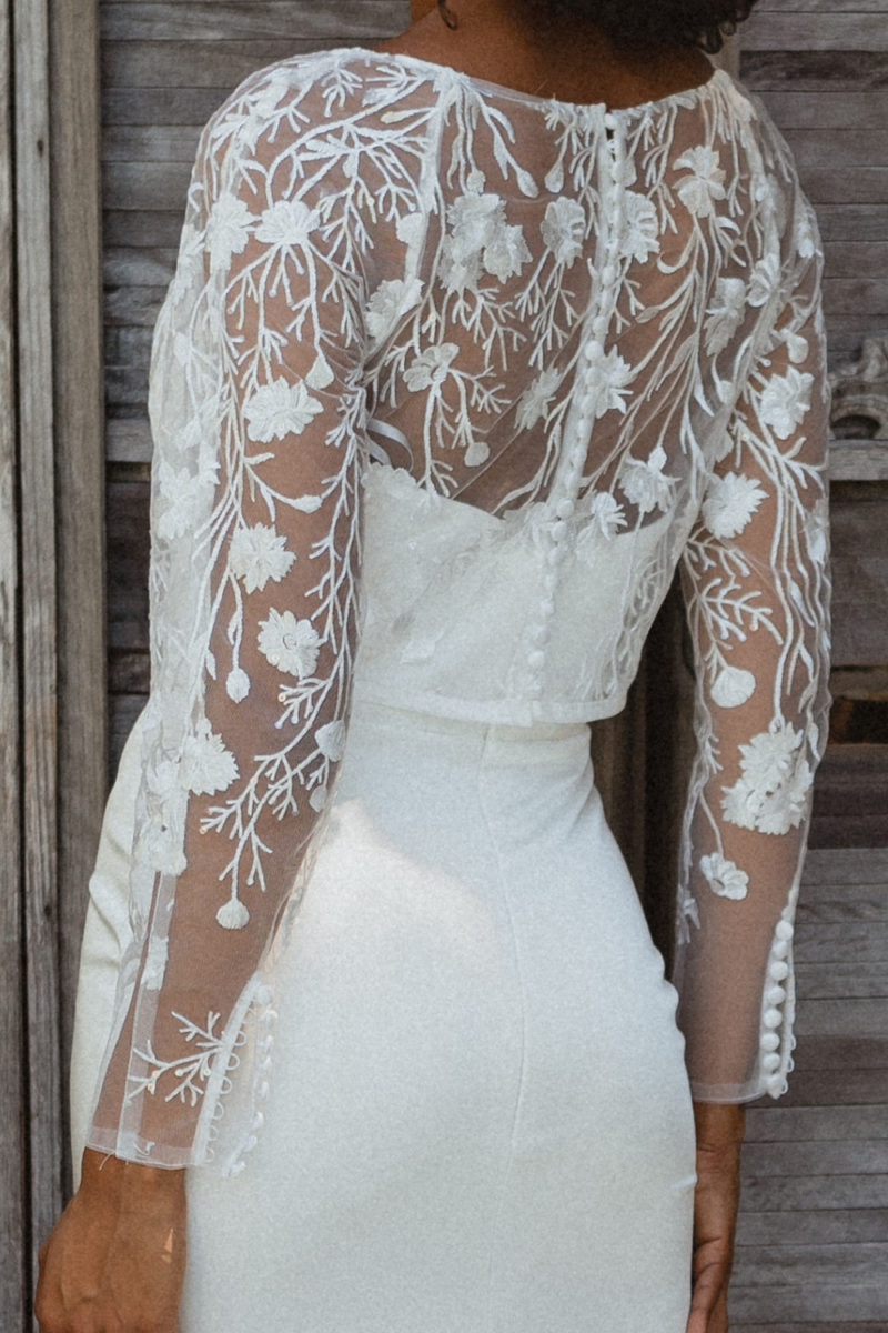 The Nairobi TC366 long sleeve detachable wedding dress top by Tania Olsen Designs is an enchanting addition to any wedding dress. Gone are the days of having to purchase multiple dresses for your wedding! You can now easily transition from traditional ceremony to modern reception simply by removing the top. Constructed from a floral lace, the Nairobi has a relatively high scoop neckline and a sleek cropped bodice for a close to body fit. This piece features long sheer sleeves with thoughtfully placed lace appliqué. The back is zipper free and utilises button and loop closures for a delicate and classic finish. The Nairobi is available in Vintage White in sizes AU 4-30.