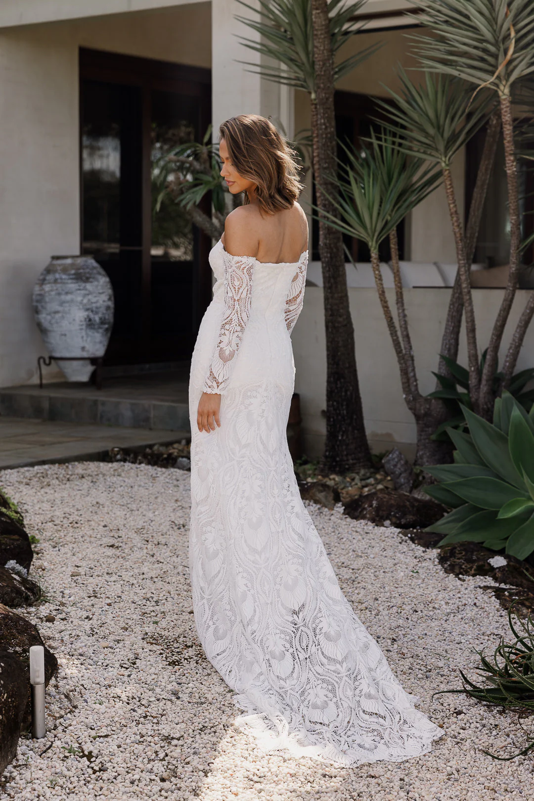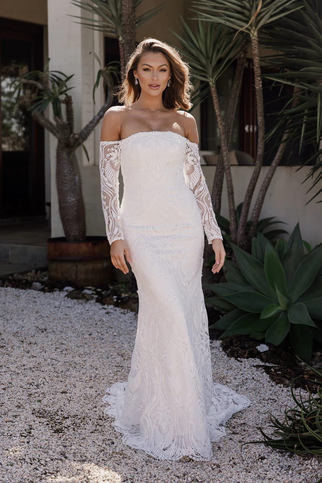 The Auralie TC401 Bridal Dress is a long fitted gown with a small train, off the shoulder sleeves and gorgeous patterned lace material. Available for order in sizes 4-30. We have size 10 in store for you to try on.
