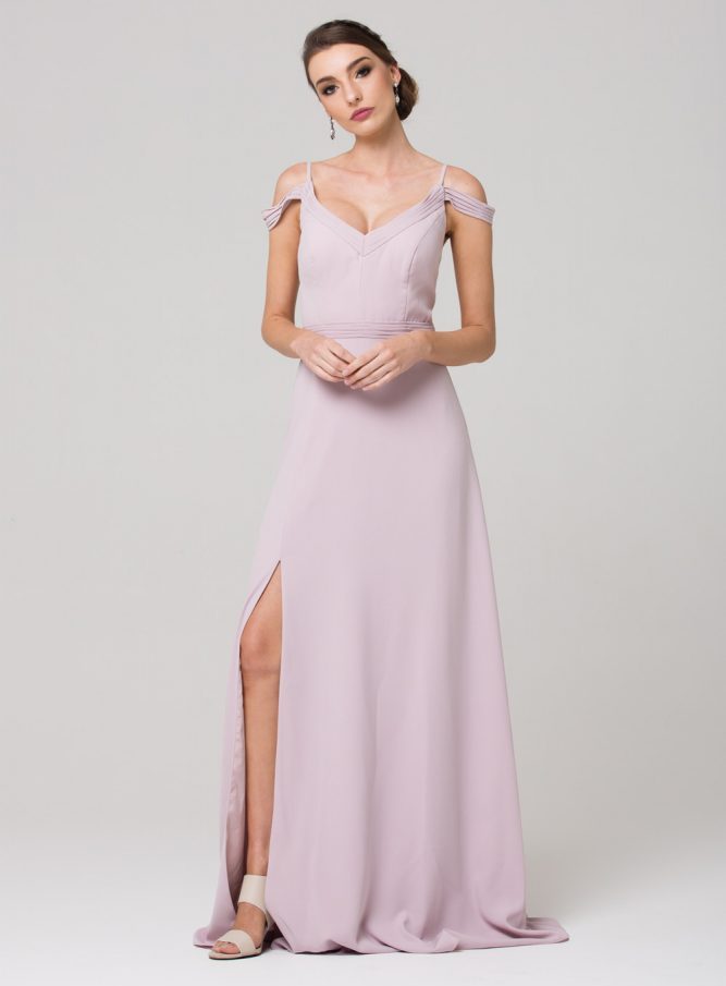 The Natasha TO63 bridesmaid dress by Tania Olsen Designs embraces all things romantic and feminine. The Natasha features a fitted bodice with a v-neckline set with delicate off-shoulder straps that fall into a v-back. From the pleated belt waistband falls a straight floor length skirt with a leg split. This design is constructed with a soft crepe fabric that falls beautifully, flatters the body and is comfortable to wear. It’s a great year round option too that can be worn again and again, the simplicity of this style also makes it the perfect formal or evening dress. This bridesmaid dress is available in dusty lilc, dusty mauve, midnight and petal in sizes AU 4-30.