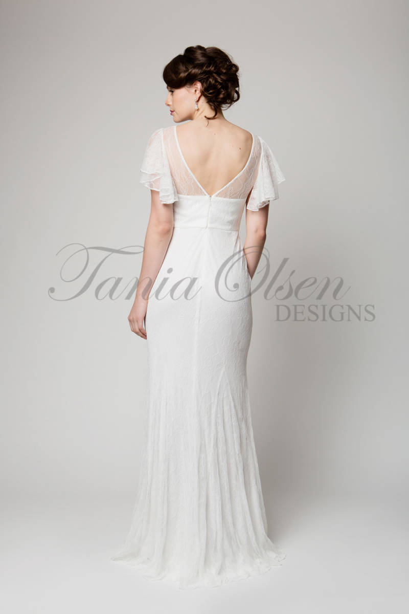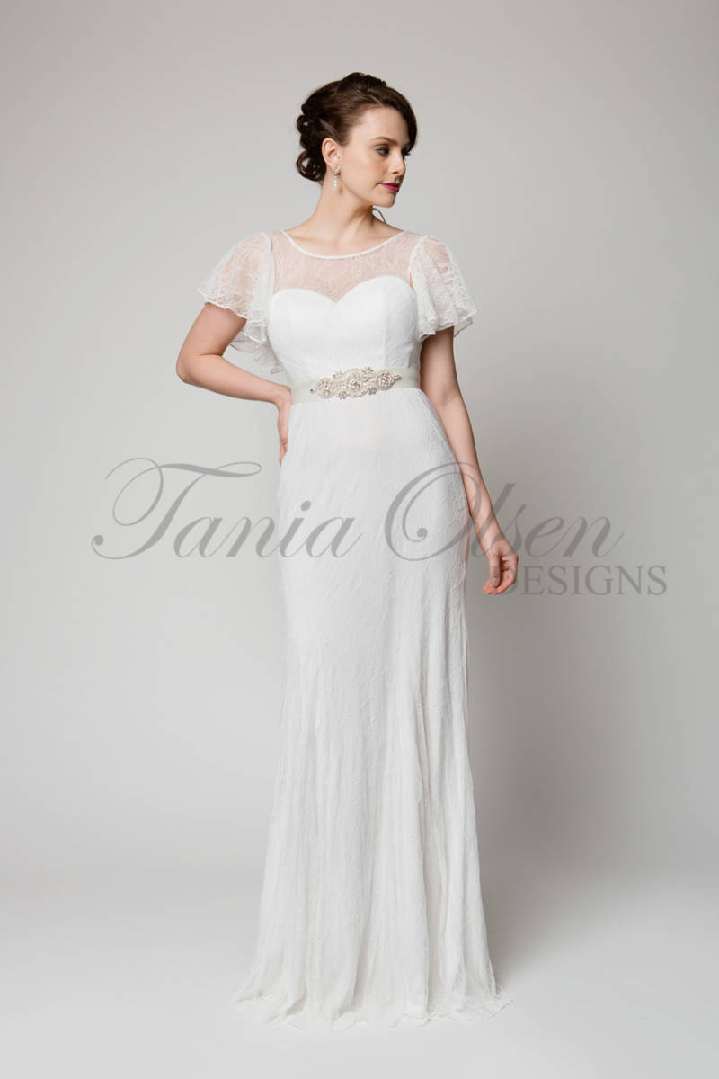 This beautiful vintage style bridal gown is made from soft lace. the belt seen in the photo can be purchased separately but is a great addition.