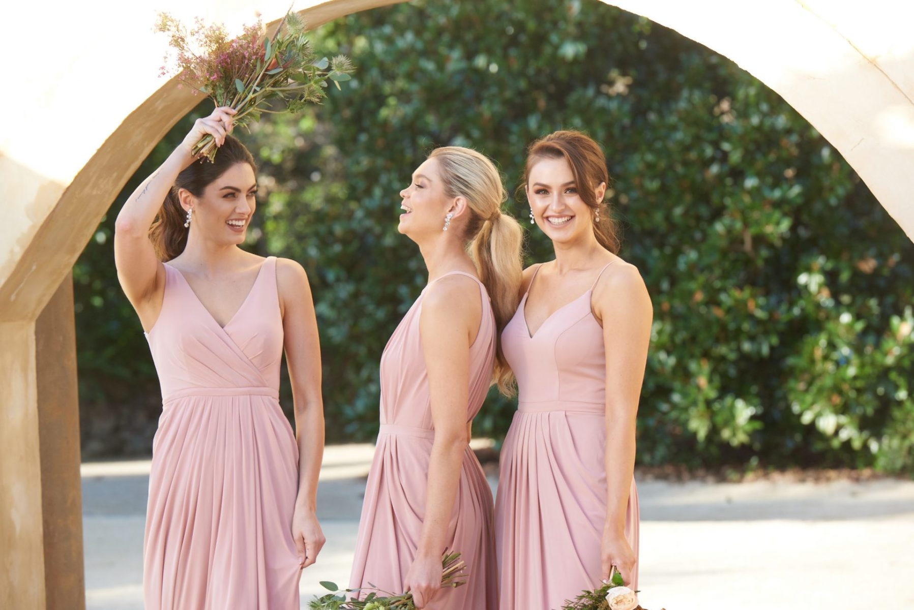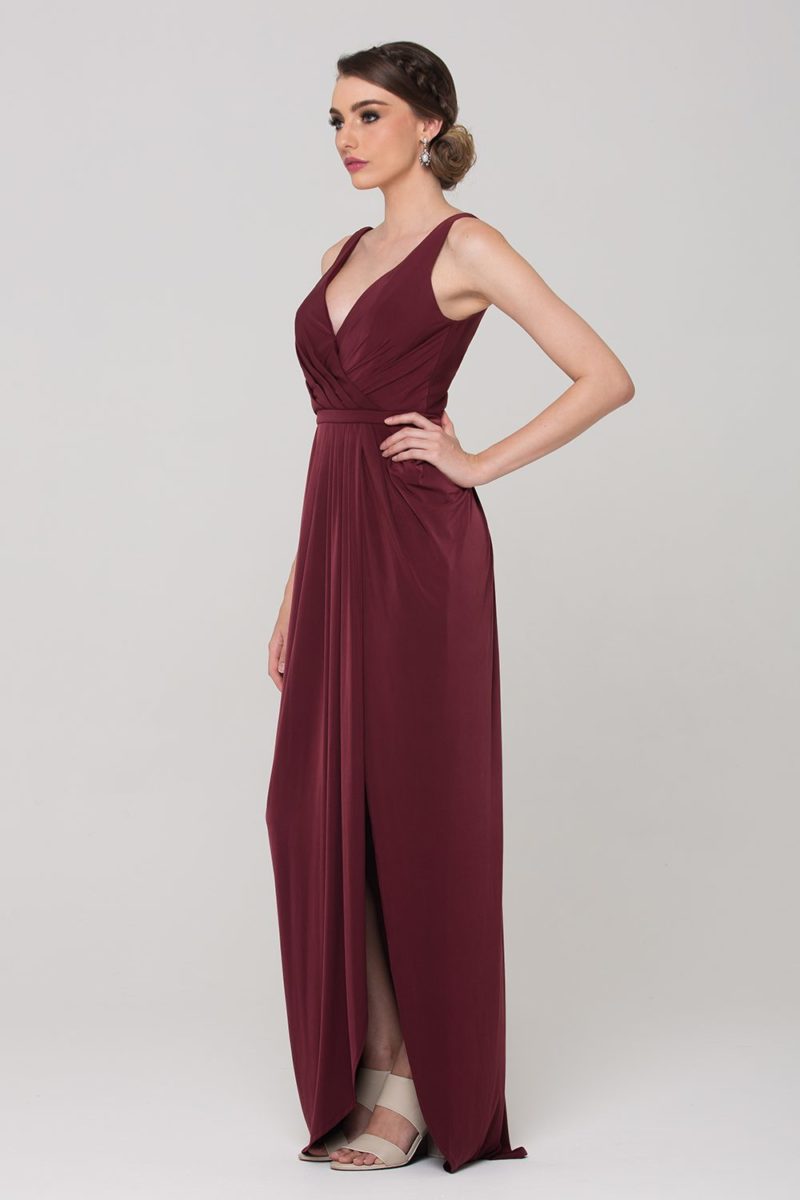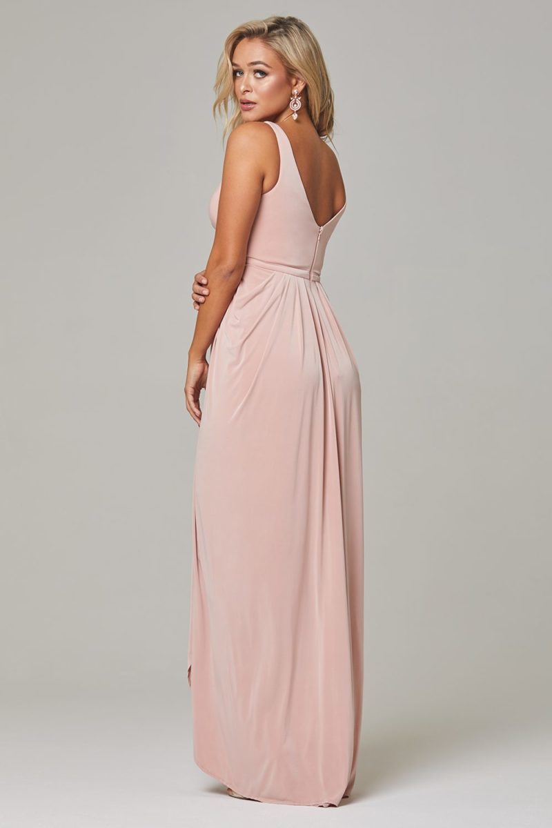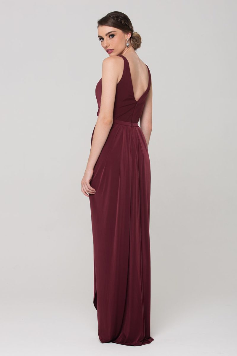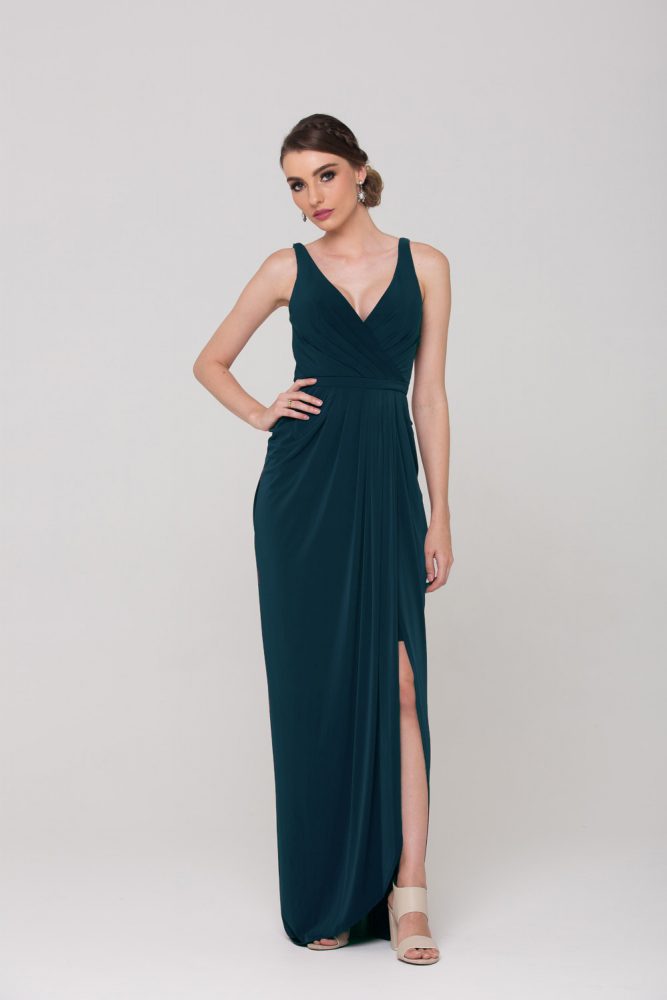 The Bianca TO72 Formal or bridesmaid dress by Tania Olsen Designs is a classic and flattering style from the soft jersey bridesmaid collection. The Bianca features a fitted bodice with a v-neckline set with think straps that fall into a v-back. From the thinly belted waistline falls a draped floor length skirt with a high leg split. This design is constructed with a soft jersey fabrication that is lightweight, soft and feels like a dream to wear. The simplicity of this style makes it a beautiful formal or evening gown. The gown’s cut and design is supportive and flattering to all shapes and sizes. This bridesmaid dress is available in 10 + colours in sizes AU 4-30.