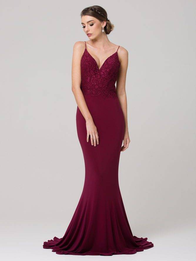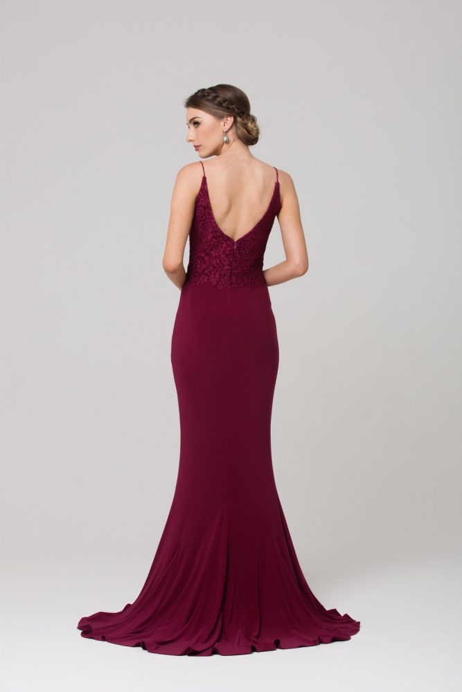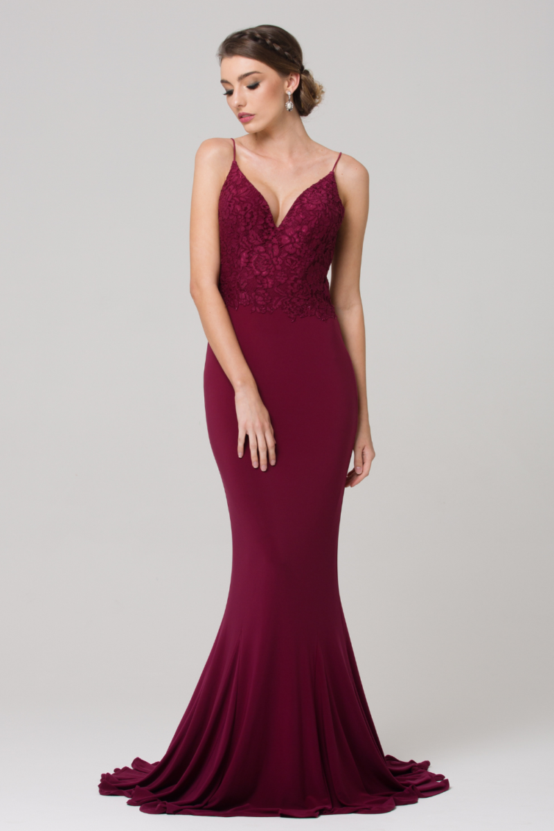 Hollywood glamour in the alluring Liana TO777 gown, a modern twist of sophistication for a show stopping bridal party or other formal occasion. The stunning luxury of this style also makes it a beautiful formal, or evening gown. Designed with flattering stretch jersey fabric for a smooth fitted look and adorned with classic corded lace give it a timeless finish. The deep sweetheart V-neck is complimented by a semi-low back with fine straps to add to the delicacy of this style. The luxe weight of the jersey cascades into a slight flare for balance and depth with a invisible zip back for seamless closure.