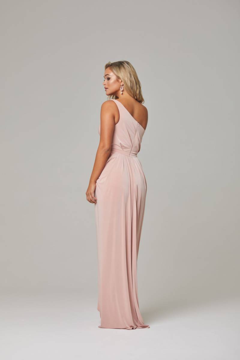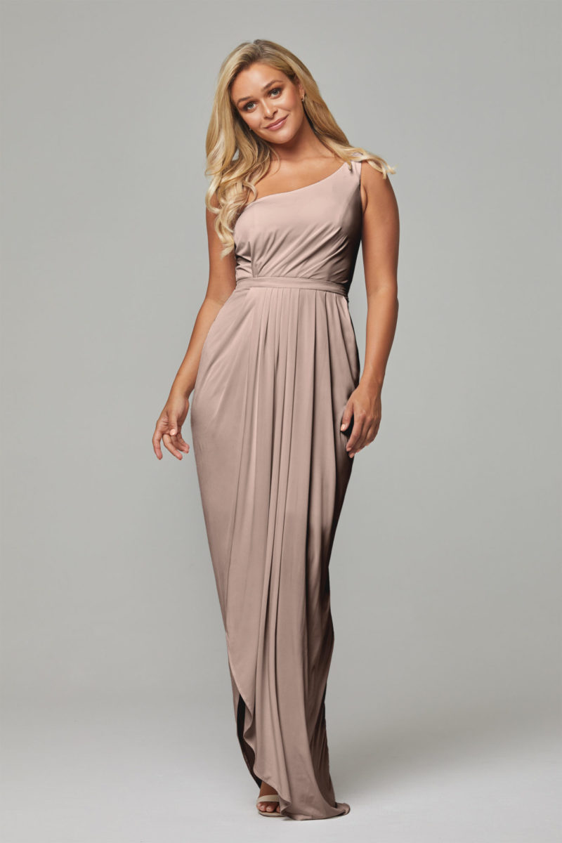 The Eloise T800 Evening formal or Bridesmaids Dress features a tulip design skirt with a sultry leg split. This stunning design is held at the shoulder with a flat strap and falls beautifully into a comfortably fitted bodice.