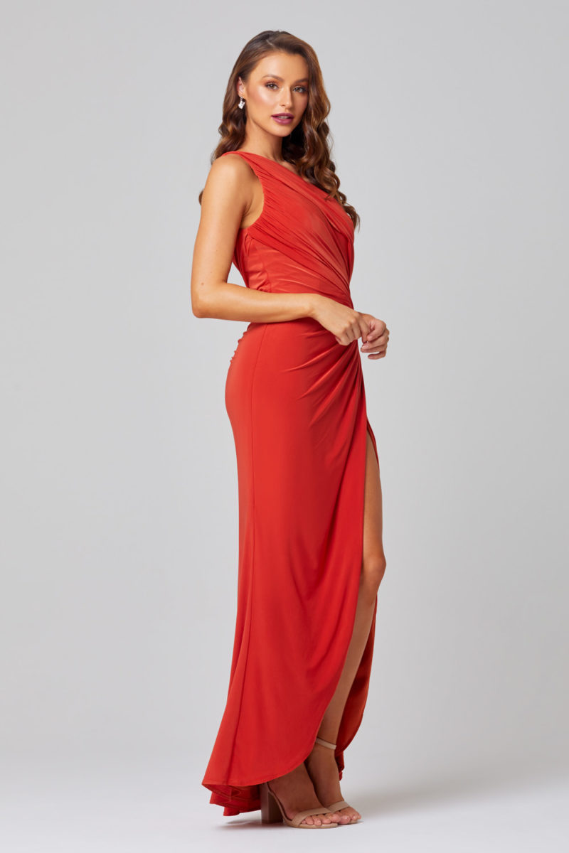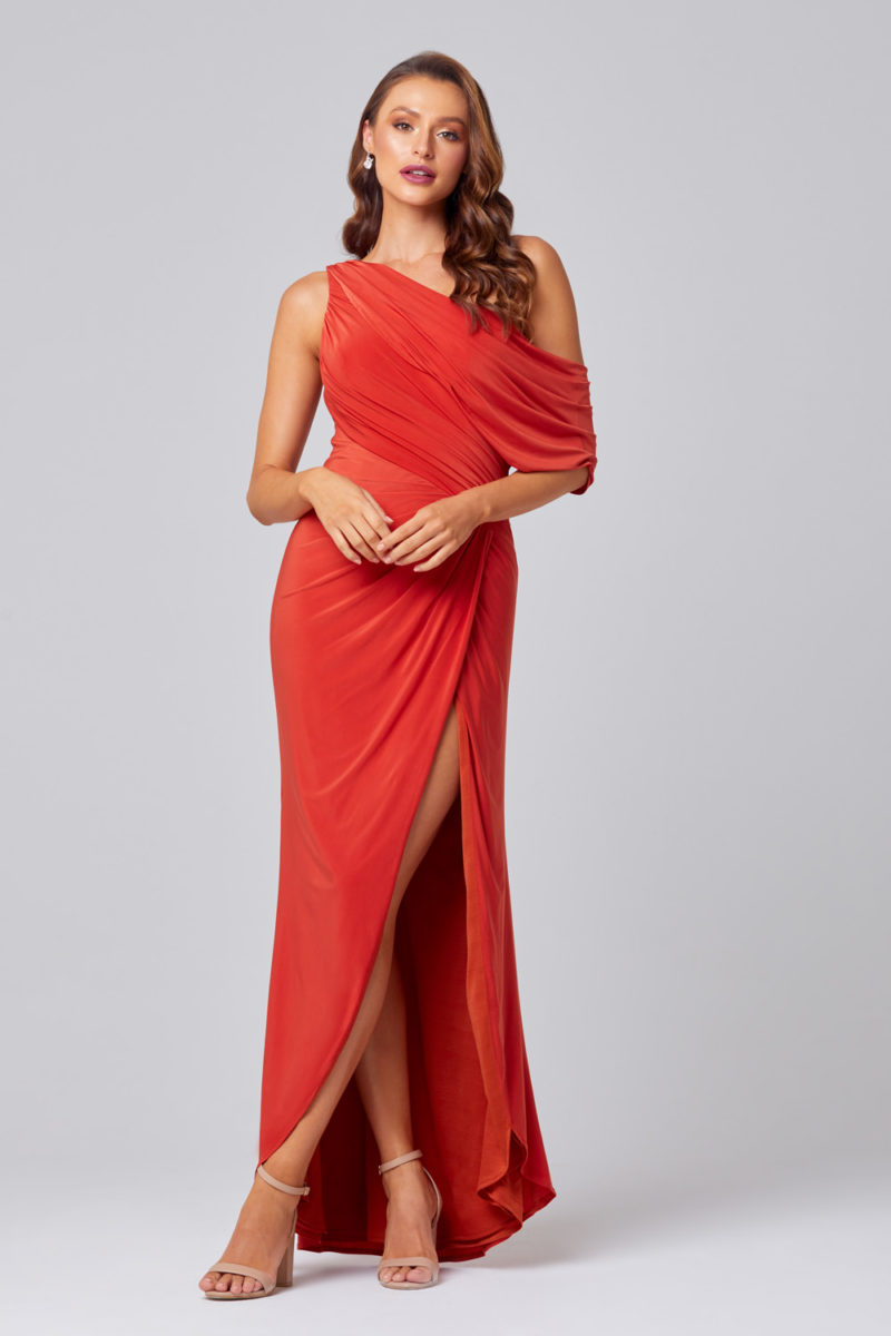 The Polly TO846 dress by Tania Olsen Designs is a comfortable, effortless design that makes the perfect formal dress. The Polly features a one shoulder neckline with asymmetric arm detailing on the front and rear. The gathering detail is a standout feature on the front of the dress and also continues onto the back. From the waistline falls a fitted floor length skirt and high leg split. This flattering dress is available to purchase in Burnt Orange
