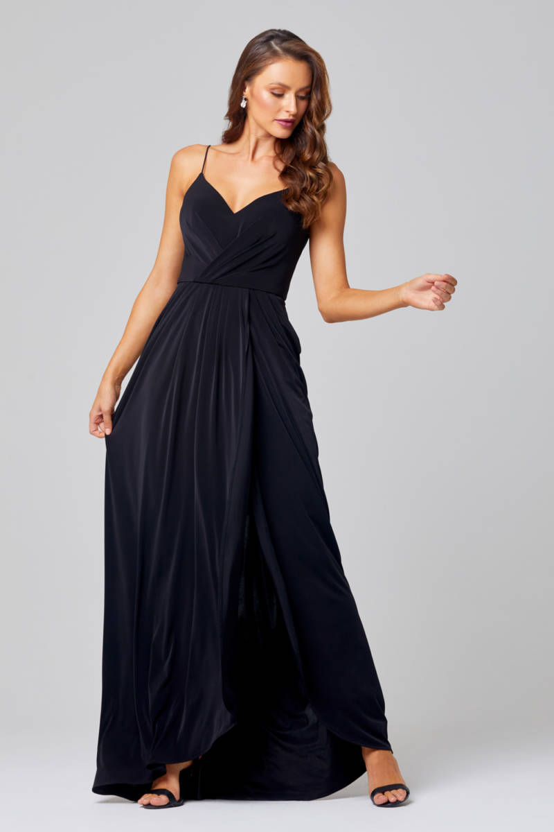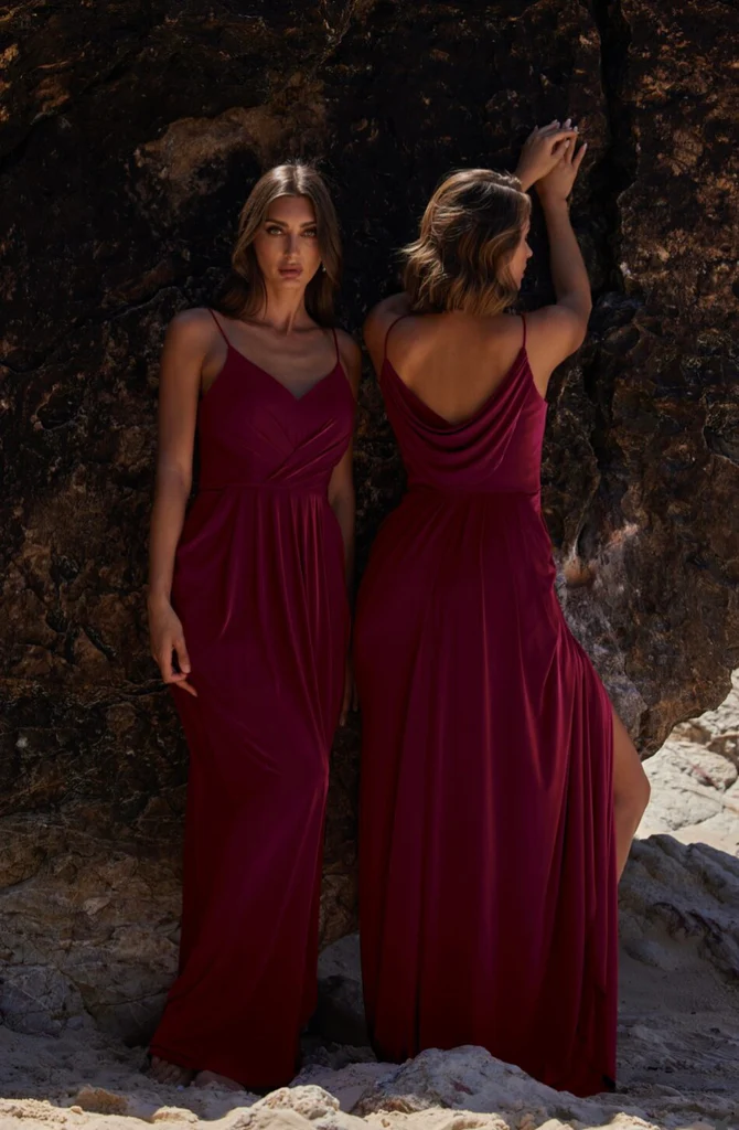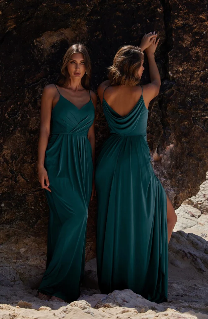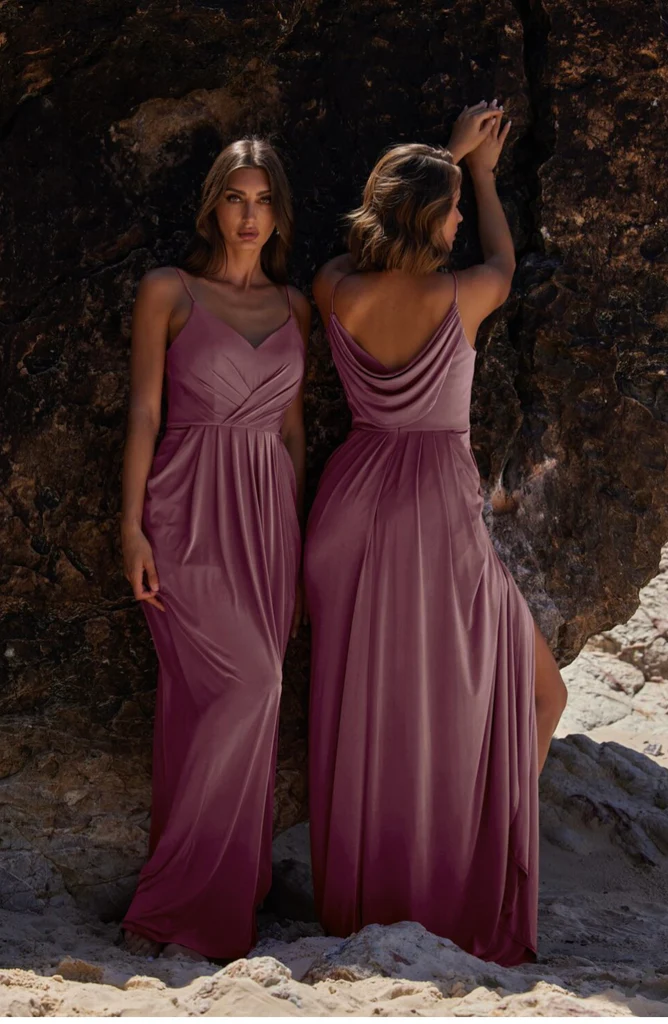 The Ebonie TO847 dress by Tania Olsen Designs is a comfortable, effortless design that makes the perfect Formal gown. The Ebonie features a V neckline and spaghetti straps that sit on the shoulders and V shaped back. The vintage-inspired cowl detail completely hides the back zipper, which emphasises the beautiful minimalist design. This design is crafted from a soft jersey knit fabric and is an amazing year round option because of the versatile fabric and colours. This flattering dress is available to purchase in Black, Vintage White, Navy, Teal, Dusty Indigo, Pink, Blush, Wine, Burnt Orange and Pine.