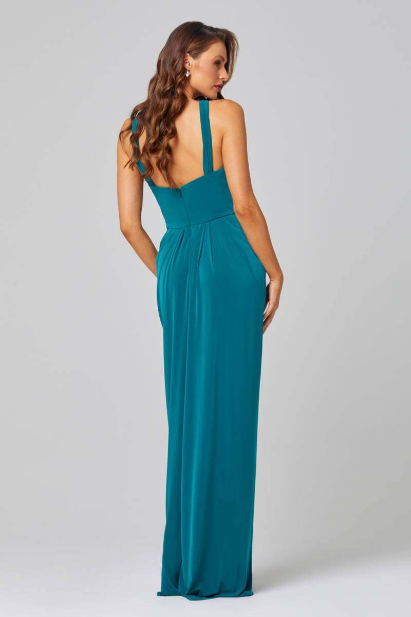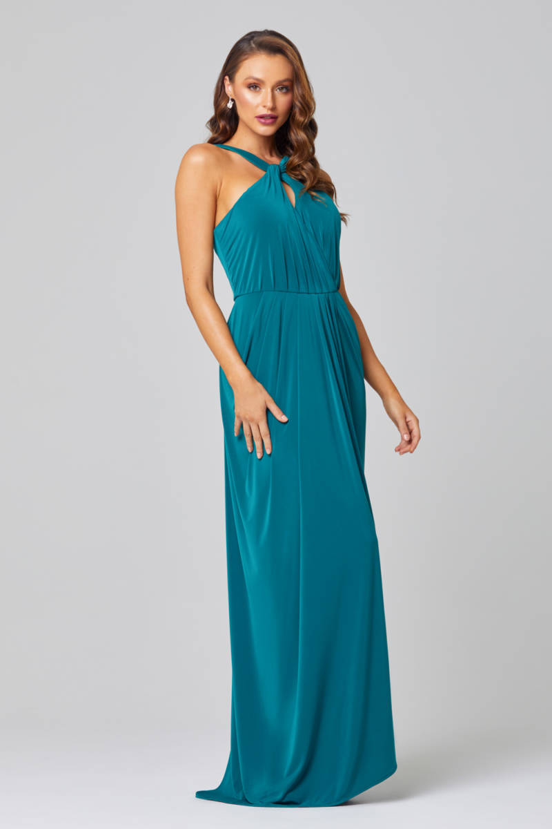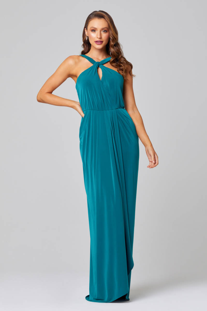 The Suki TO848 dress by Tania Olsen Designs is a unique dress that is a comfortable and supportive design. The Suki features a high twisted strap neckline with keyhole detail, and straps that then untwist to be sitting straight and flat against the rounded back. Adding a touch of glamour, the skirt is of a classic silhouette and has a daring leg split. This design is crafted from a soft jersey knit fabric and is an amazing year round wedding, Ball or Formal option because of the versatile fabric and colours. This flattering dress is available to purchase in Pine, Black, Vintage White, Navy, Teal, Dusty Indigo, Pink, Blush, Wine, and Burnt Orange