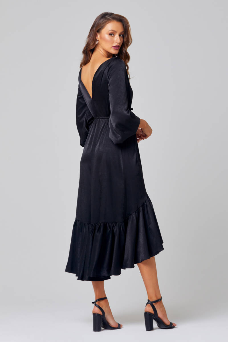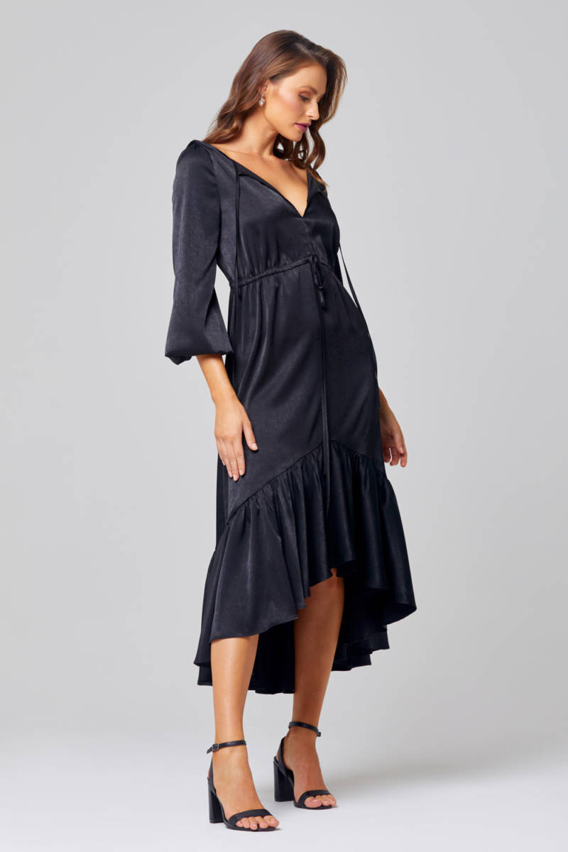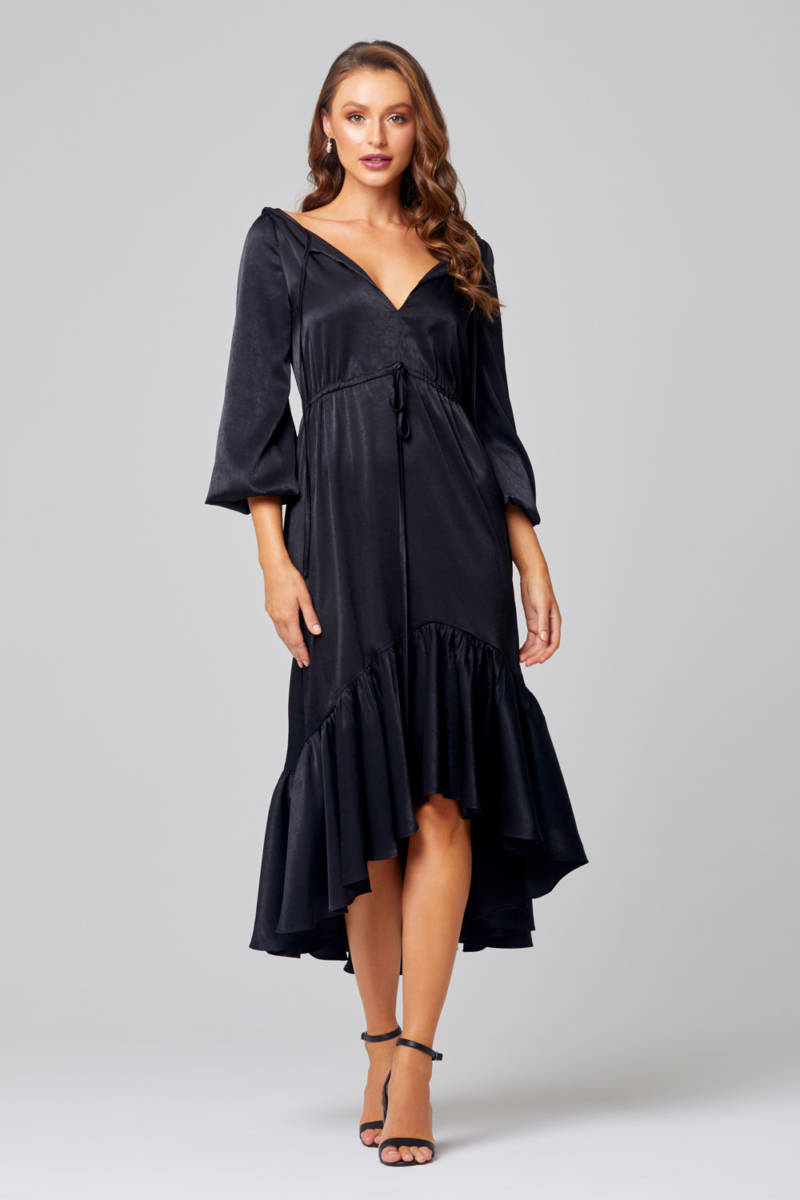 The Allie TO852 bridesmaid or Cocktail dress by Tania Olsen Designs is a unique dress unlike any other design in our current collections. Allie features a slightly plunging neckline and a mirroring v cutout in the middle of the back. A few gorgeous elements of this sweet little dress is the ruffle hem detail, self tie waist and chic balloon sleeves. A great draw do this design is the high to low hemline, which makes it a more appropriate dress to wear all year round! Plus it’s very easy to wear it again and again! Available in Black and Rose