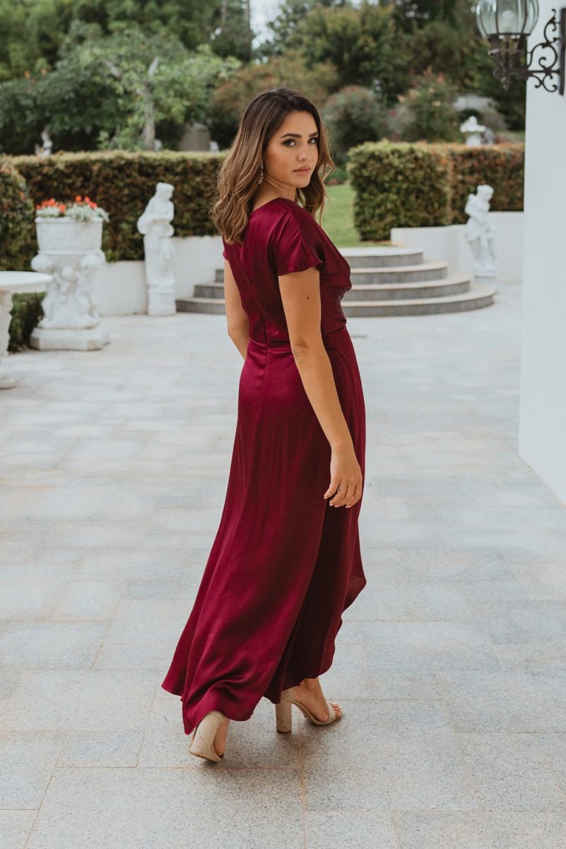 The Napier TO868 Formal dress by Tania Olsen Designs. This dress features a structured crossover bodice with pleated gathering detail, a v-neckline and cap sleeves. From the waistline fails a softly pleated midi length skirt with high low detailing that moves beautifully when worn. This design is crafted from a silky satin fabrication that is lightweight and comfortable to wear. The Napier is available to order in Wine