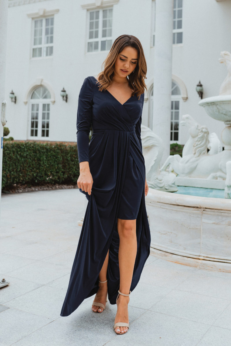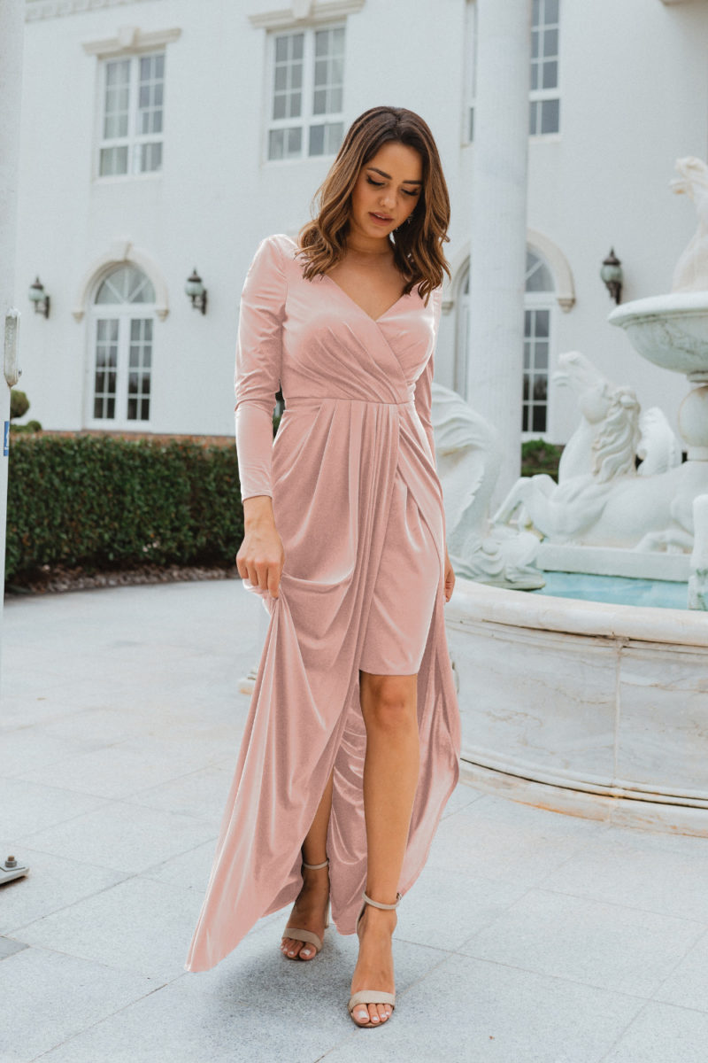 The Nancy TO870 Formal or bridesmaid dress by Tania Olsen Designs is a modest yet chic option for wearers of any age. The Nancy features an elegant v neckline, wrap style bodice and full length sleeves. From the waistline falls a fitted floor length skirt gathering through the middle, and a leg split with a tulip side opening. This design is crafted from a soft jersey knit which is an amazing option all year round. The Nancy is available in Teal, Champagne, Vintage White, Navy, Dusty Indigo, Blush, Wine, Burnt Orange, Pine, Black and Tea Rose in sizes AU 4-30.