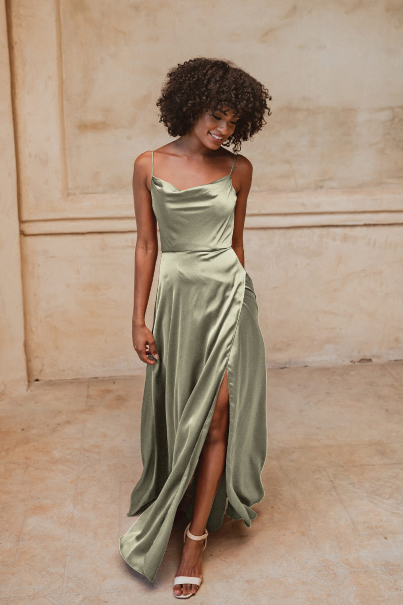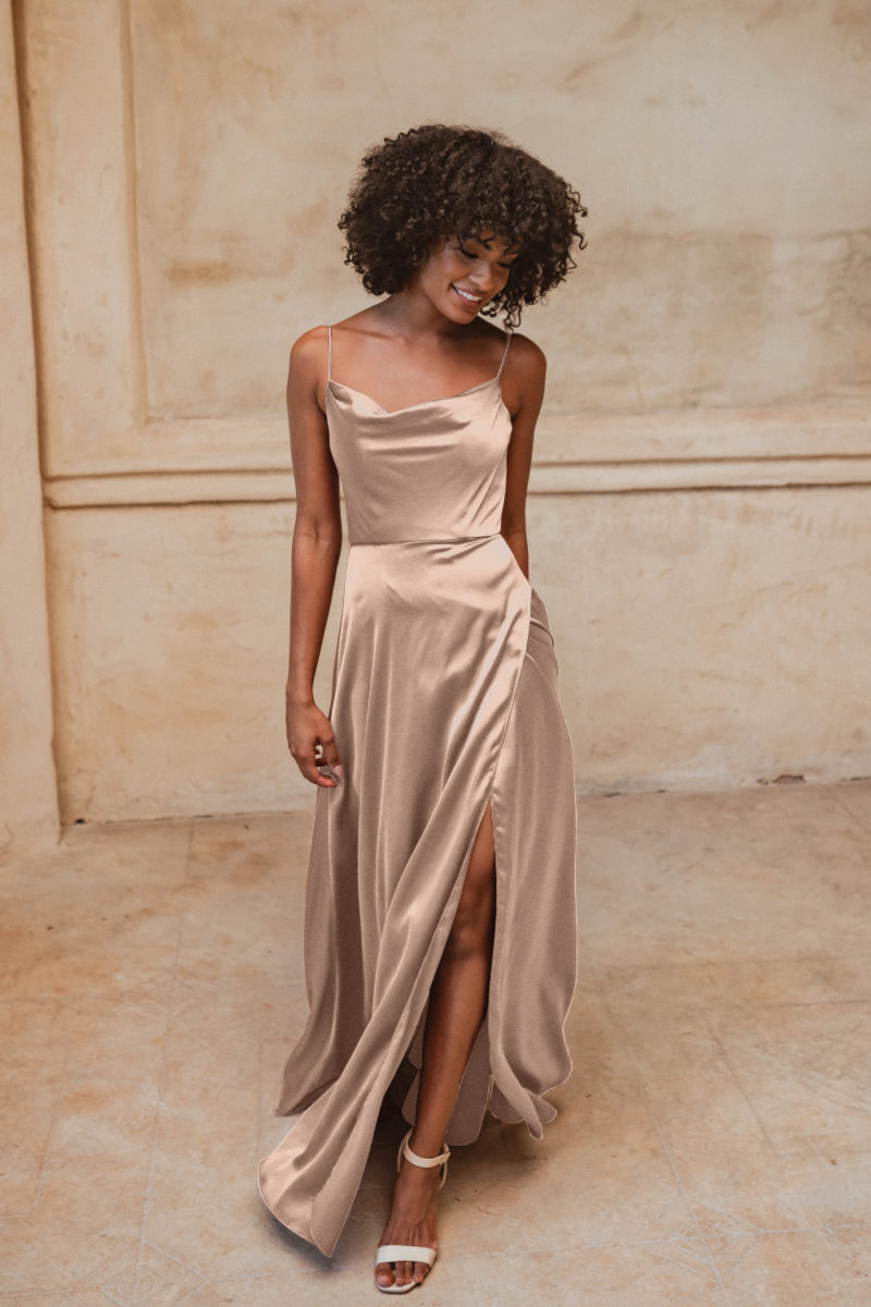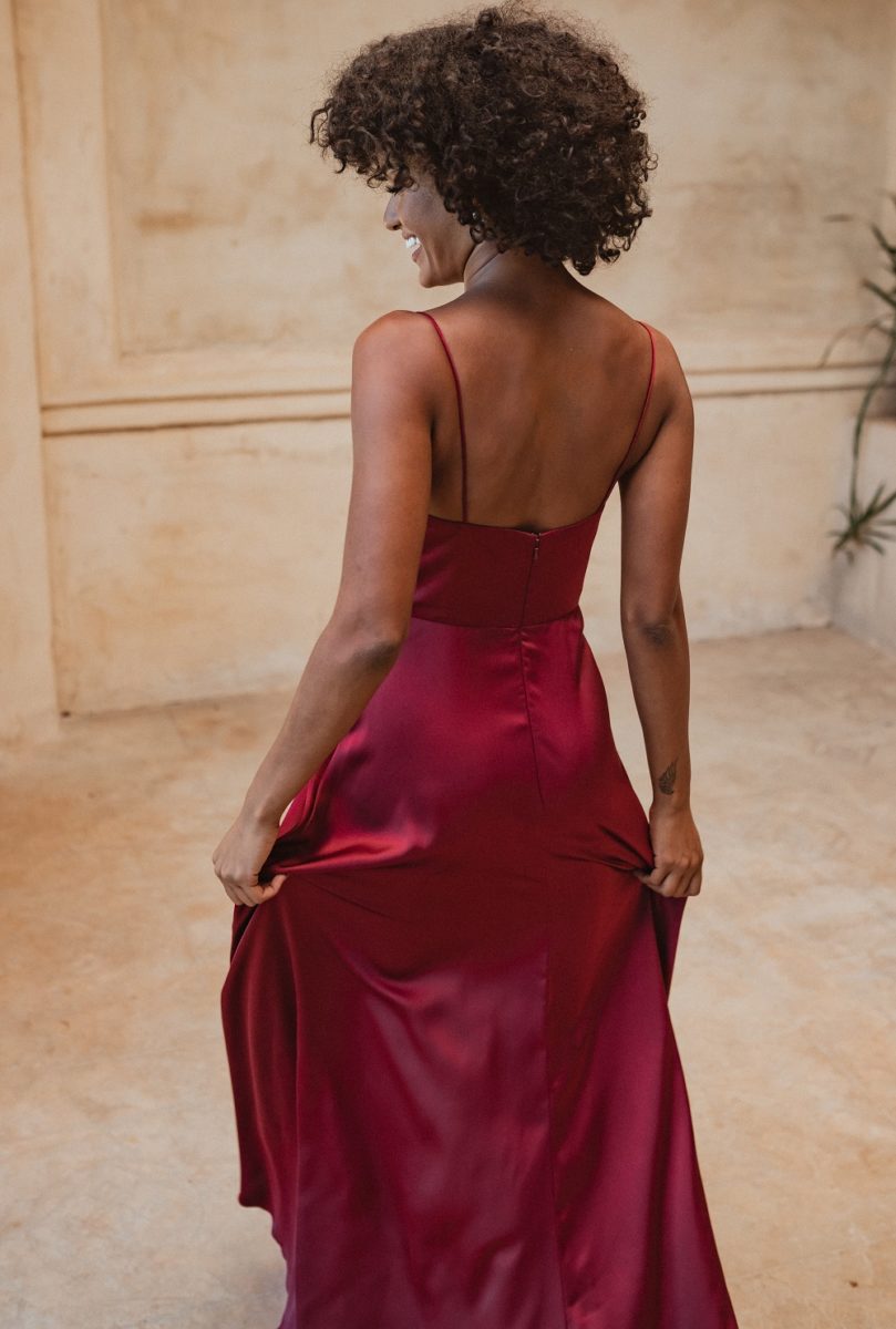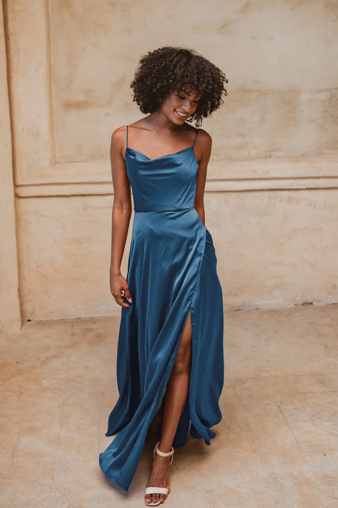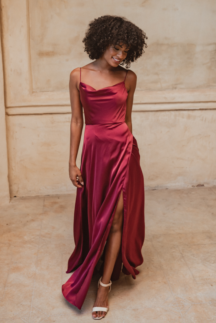 The Denver features a soft cowl neckline and delicate spaghetti straps that frame the shoulders, while the open square back adds a touch of understated glamour. The floor-length skirt falls gracefully from the waist with a daring thigh-high split — perfect for showing off your heels (and your confidence).