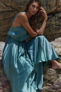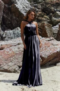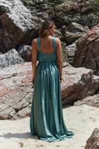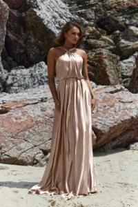 This dress is a light and airy bridesmaid dress perfect for both beach side weddings and traditional church ceremonies. The loosely draped bodice comes together at the neckline in a delicate twist which crosses over to the back of the dress. The back straps feature light gathering which creates gorgeous pleated details, elevating the style to new levels. Bloom has a floor length, A-line skirt with pleats and gathers at the waist to give you unrestricted movement.
