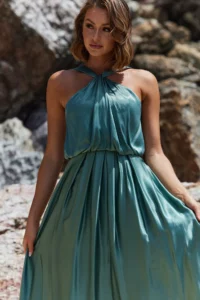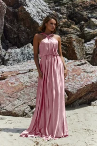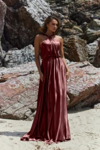 The Bloom TO886 is a high neck bridesmaid dress with wide straps, a pleated A-line skirt and is available in sizes AU 4-40.