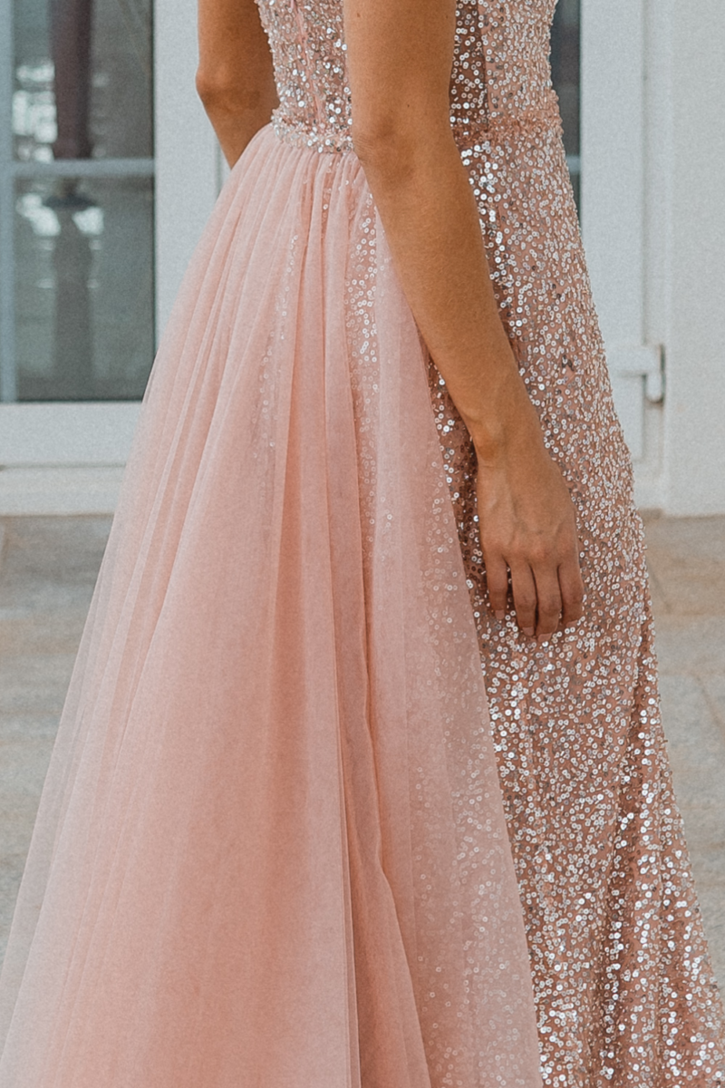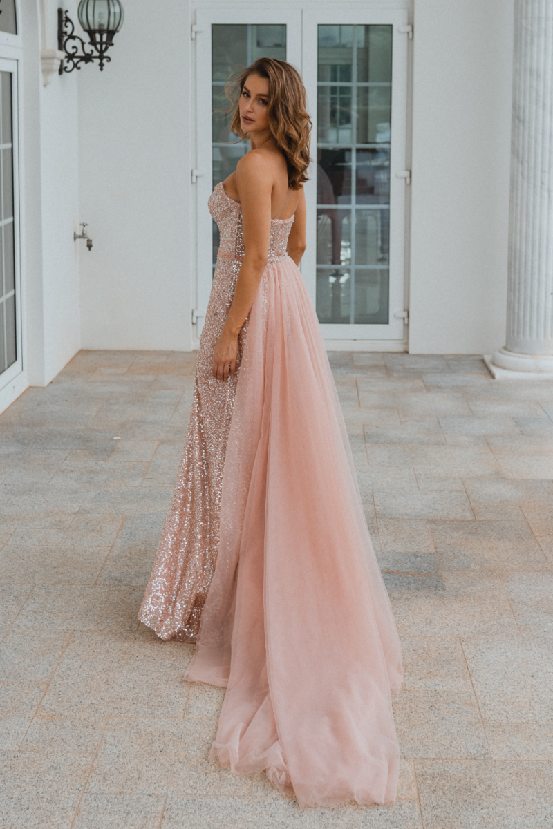 The Houston TC355 evening dress by Tania Olsen Designs is designed for the glamorous girl looking for a dress with drama. Featuring a strapless fitted scoop neckline with a modern tipped corset. Constructed with a mesh lining to avoid any skin irritation from the sequin embellishments. The waistline features a delicate beaded Swarovski crystal band, flowing through to a floor length skirt with a daring leg split. It has added drama with the detachable back skirt train constructed from a soft tulle fabric. Wear it with our without the detachable skirt train. The Houston is available in Rose Gold in sizes AU 4-30.
