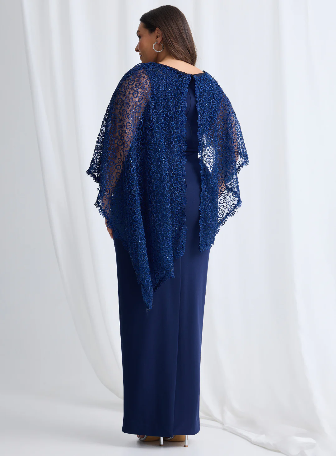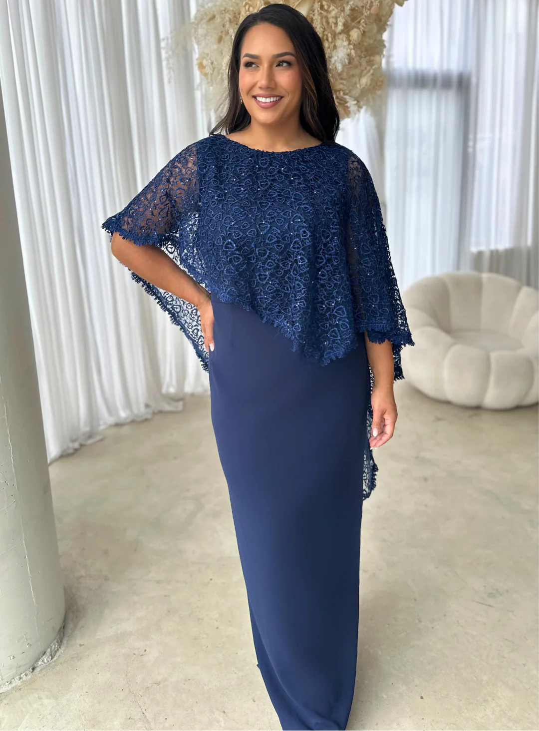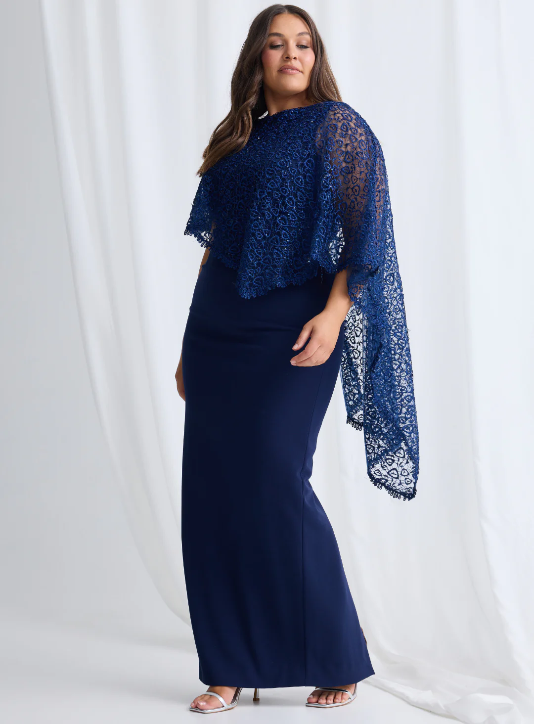 A gorgeous full length dress by Trellis Lane. A maxi style featuring a sequin lace overlay. Main dress is crafted from a stretchy textured crepe fabric.