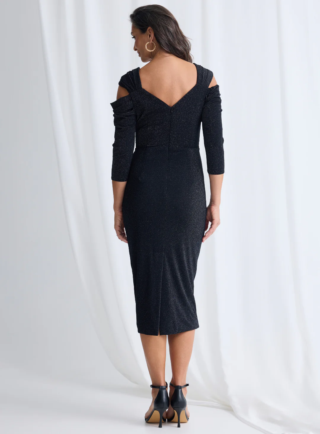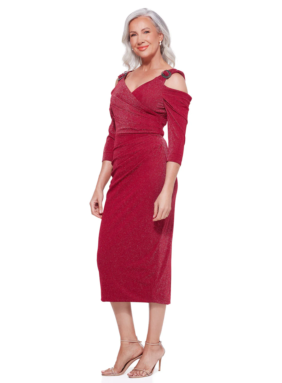 A gorgeous midi dress by Trellis Lane. A stunning design featuring 3/4 sleeves, broach detailing on the straps and shoulder cut-outs.