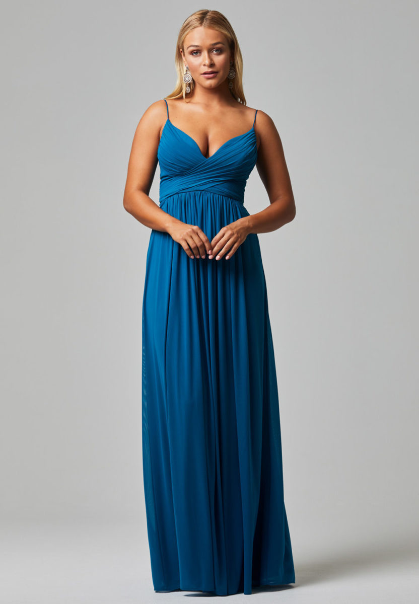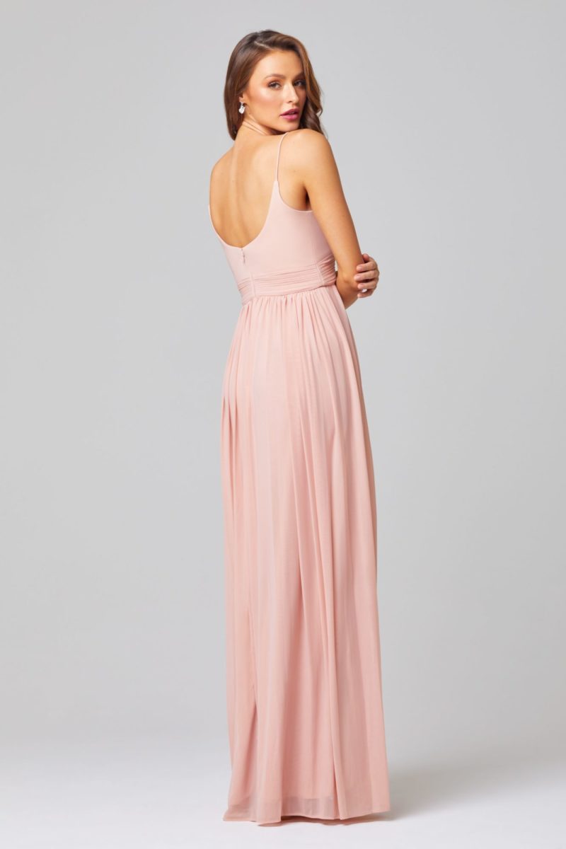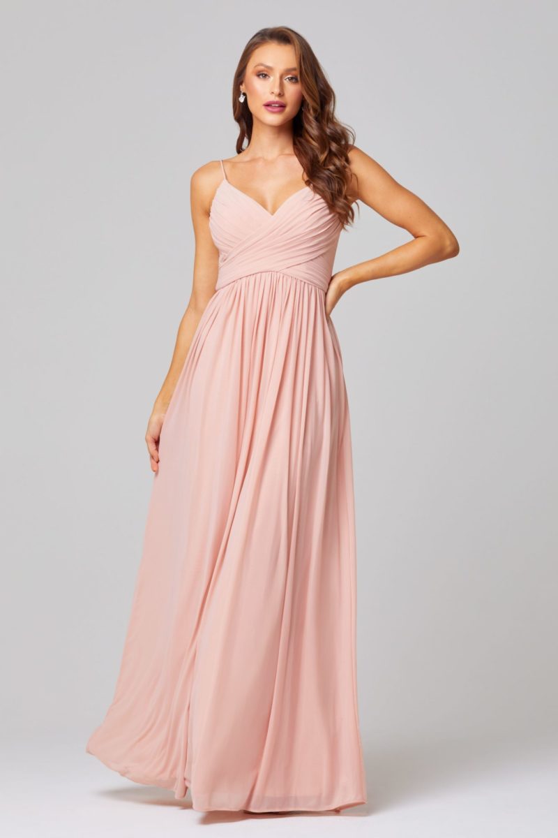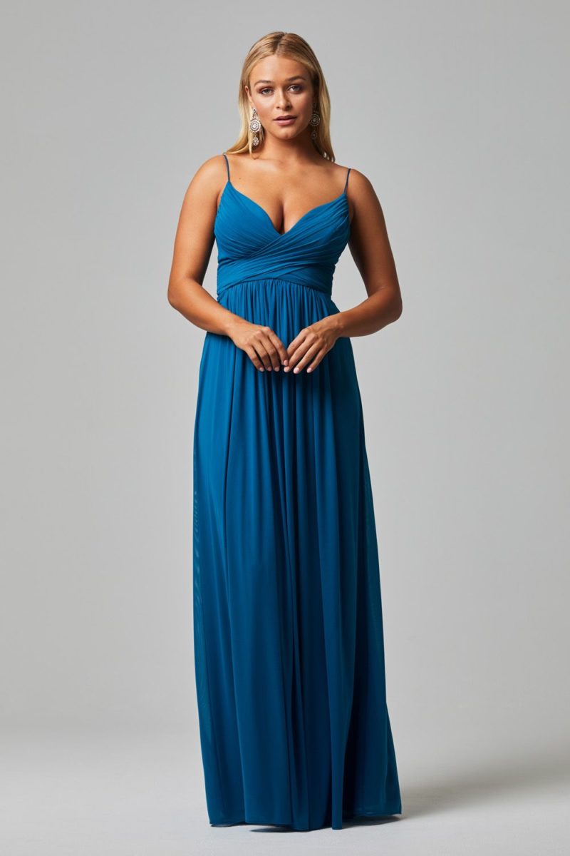 The Violeta TO819 dress by Tania Olsen Designs is a simple yet beautiful design that can suit various formal events, is very popular as a bridesmaid dress. The Violeta features a plunging neckline paired with spaghetti straps and teardrop shaped bra cups. The stand out feature of this dress is of course the crossover bodice detail that wraps around the body. The back of the dress has a low round scoop, and meets a slightly gathered waist and invisible zip. The stretch tulle fabric makes for the most flattering, flowing, floor length skirt as it perfectly falls from the waist.