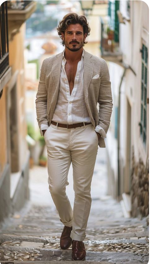 A sand-coloured suit, in particular, offers versatility — it’s formal enough for a wedding, but relaxed enough to feel appropriate in a casual or coastal setting. It also photographs exceptionally well in natural light.